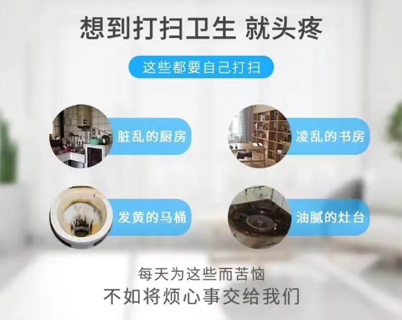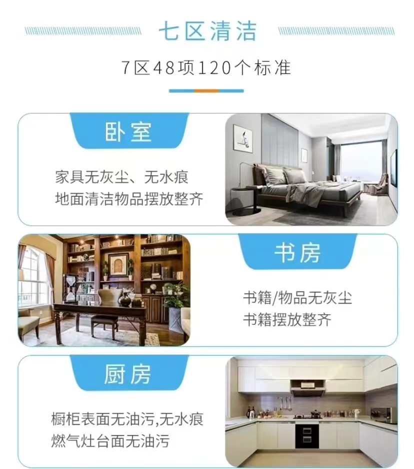 - 厨 房: 油烟机表面(不拆洗)、燃气灶、橱柜、调味组、洗菜池、地面、垃圾桶、墙面、厨房门。